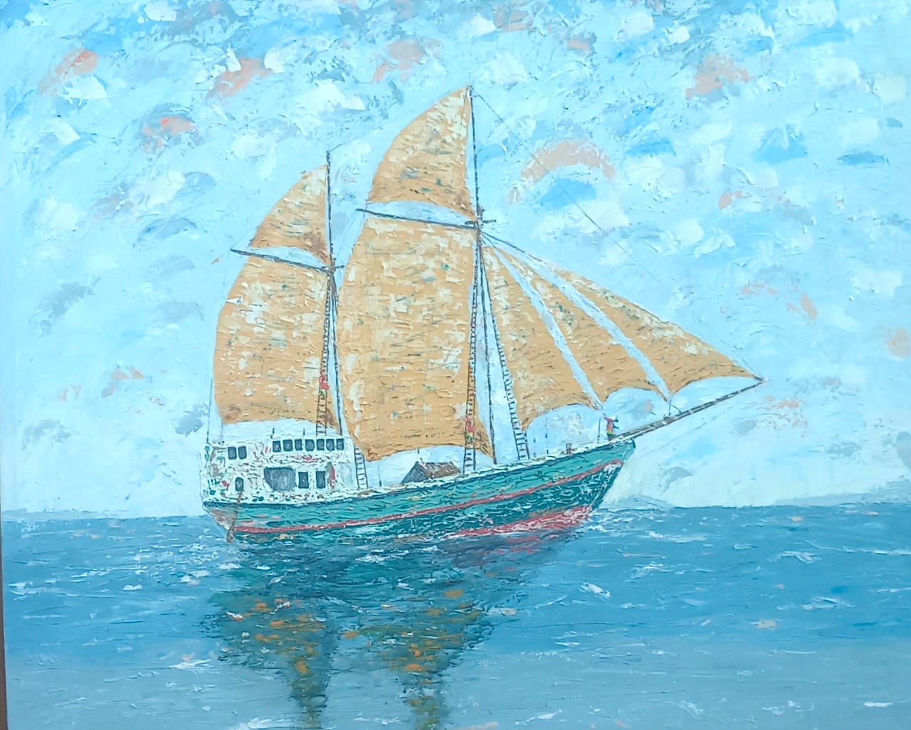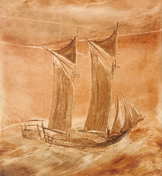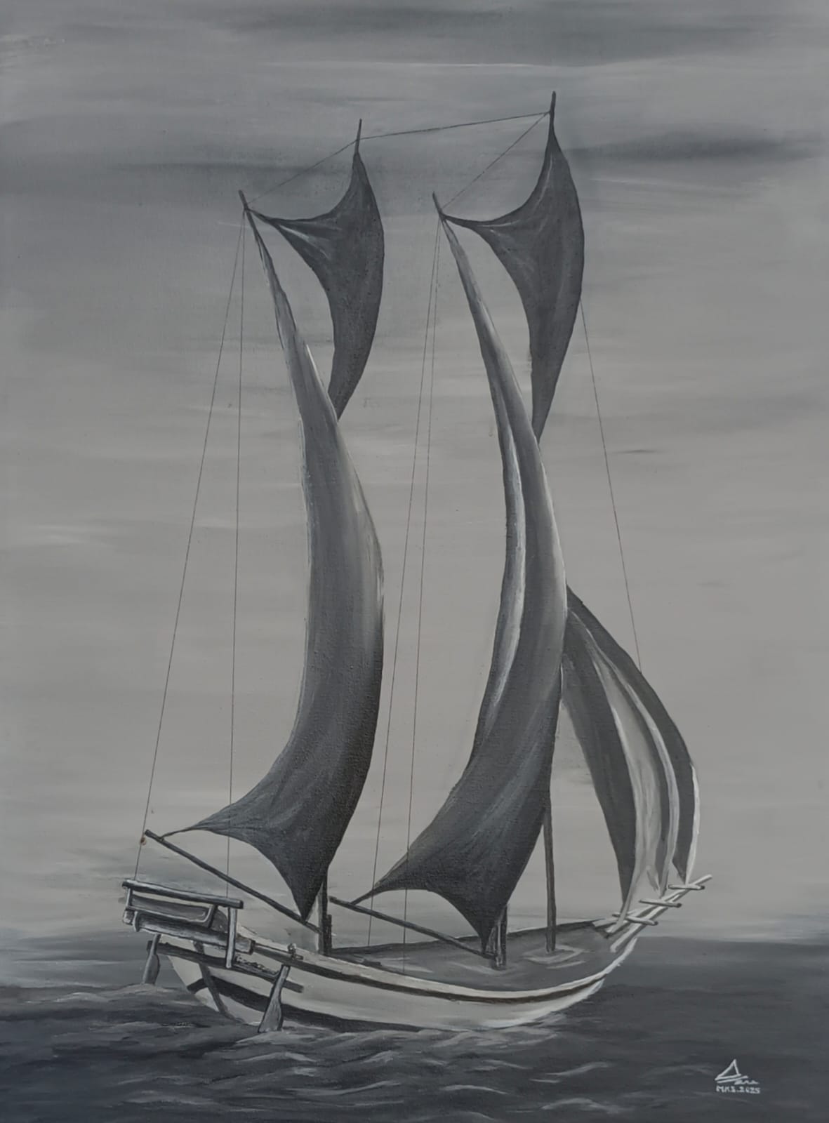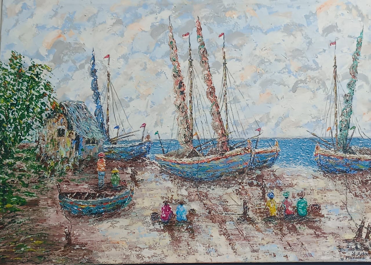 Lukisan Pinisi dengan warna latar putih menggambarkan sebuah ketenangan akan kesinambungan, kepercayaan, dan kecerdasan para leluhur dalam menciptakan karya di masa lalu.